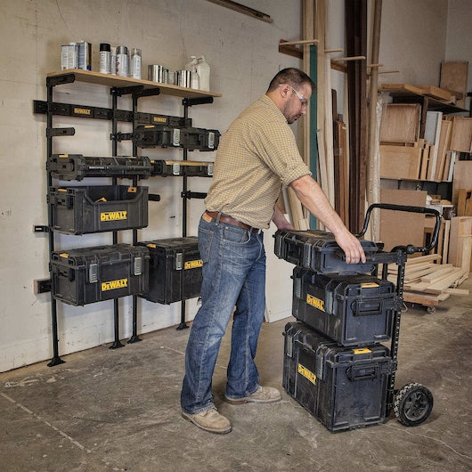DEWALT TOUGHSYSTEM® Workshop Racking System enables the storage and organization of TOUGHSYSTEM modules in a flexible variety of arrangements allowing users to modify the workshop to meet their storage needs.