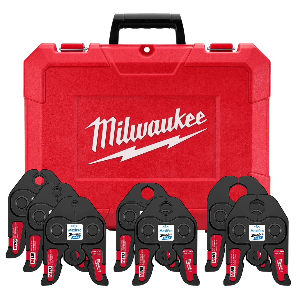 Our ¼”-1-1/8" ZoomLock® MAX Press Jaw Kit is designed to press ZoomLock® MAX Press Fittings and optimized for MILWAUKEE® M18™ FORCE LOGIC™ Press Tools. A flame‑free alternative to traditional brazing, these ZoomLock® MAX Press Jaws offer you up to 60% faster connections when installing high‑pressure HVAC and refrigeration systems. The ZoomLock® MAX Press Jaws eliminate the need for nitrogen purges, combustible gasses, and expensive silver solder necessary for traditional methods. We've optimized the press tool jaws with an easy‑open, inline design for one‑handed pressing when used with M18™ FORCE LOGIC™ Press Tools, the smallest, most intelligent Milwaukee® press tools.