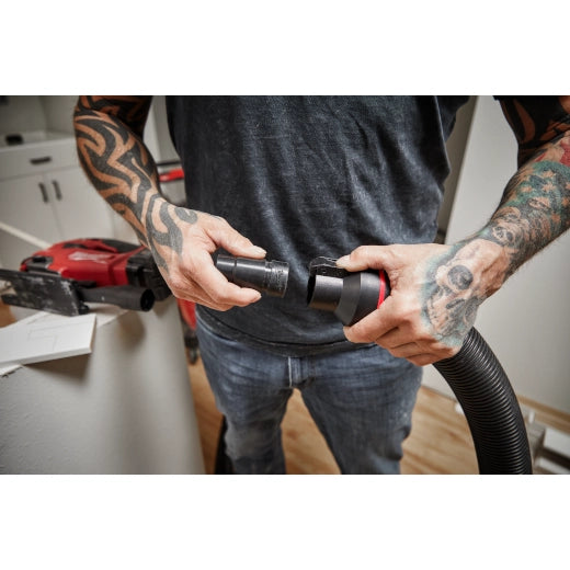 Our 2-1/2” Dust Extraction Adapter Kit allows our 2-1/2” Hoses (49-90-2004, 49-90-2006) to connect to most power tools for dust collection directly from the tool. The dust extraction kit includes three adapters for multiple different uses and tool fitment. The Hose Clip Adapter screws onto the end of the hose and connects directly to Milwaukee power tools or the other two adapters. The Power Tool Adapter clips into the Hose Clip Adapter and provides a friction fit to most power tool dust ports. The Table Saw Adapter clips into the Hose Clip Adapter and provides a secure connection to 2-1/2” table saw dust ports. The MILWAUKEE® 2-1/2” Dust Extraction Adapter Kit includes a red color ring for quick identification of its 2-1/2” diameter.
