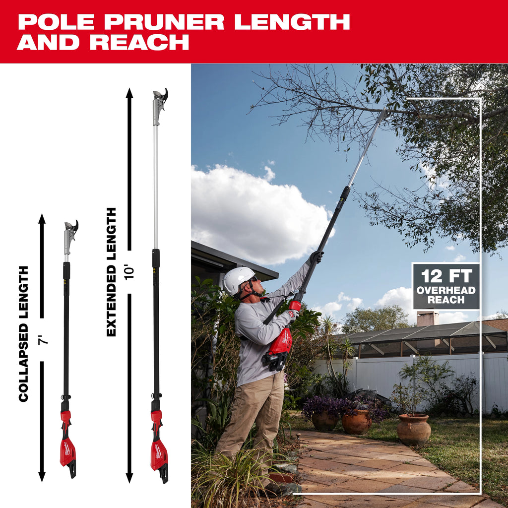 Our M18™ Brushless Telescoping Pole Pruning Shears provides users with fast clean pruning and eliminate the frustrations of pulling a manual pole pruner. These telescoping pole pruning shears allow users to make clean, precise bypass pruning cuts in branches up to 1-3/4” with minimal effort, while being able to easily telescope from 7ft. to reach a maximum length of 10ft. When paired with our M18™ REDLITHIUM™ HIGH OUTPUT™ XC6.0 Battery Pack these telescoping pole pruning shears can complete pruning applications up to 3X faster compared to standard manual pole pruners. Our M18™ Brushless Telescoping Pole Pruning Shears is fully compatible with 250+ solutions in the M18™ system